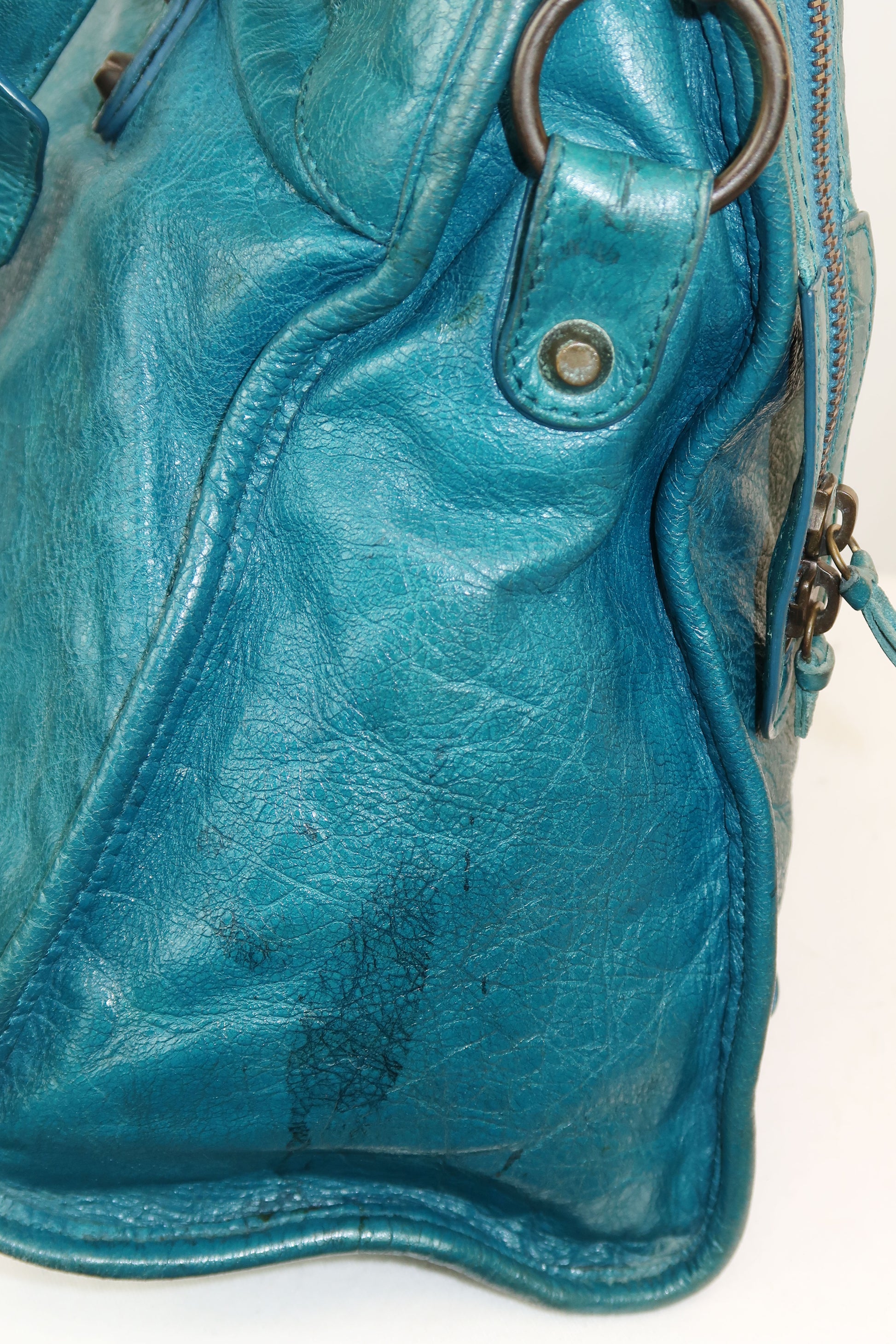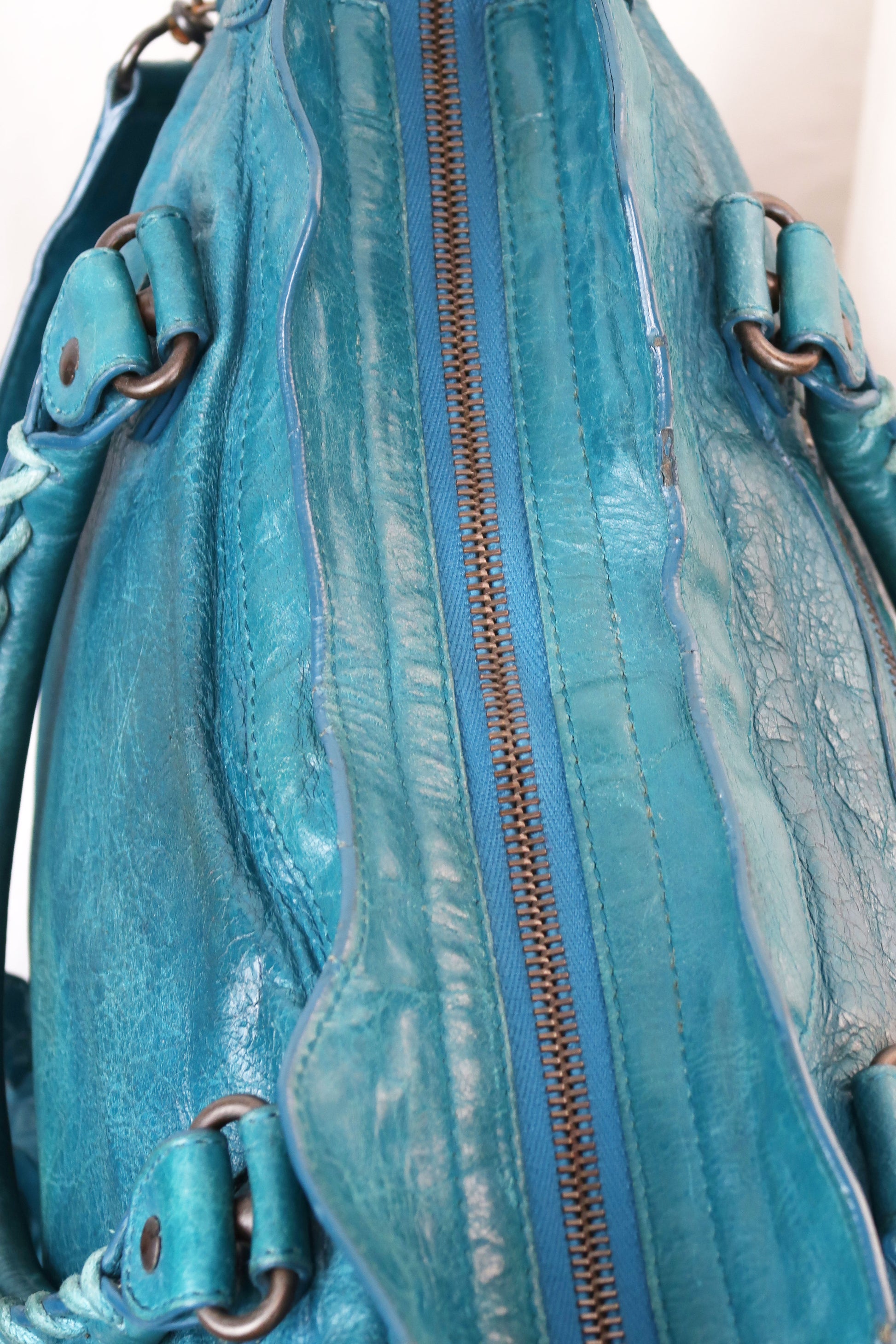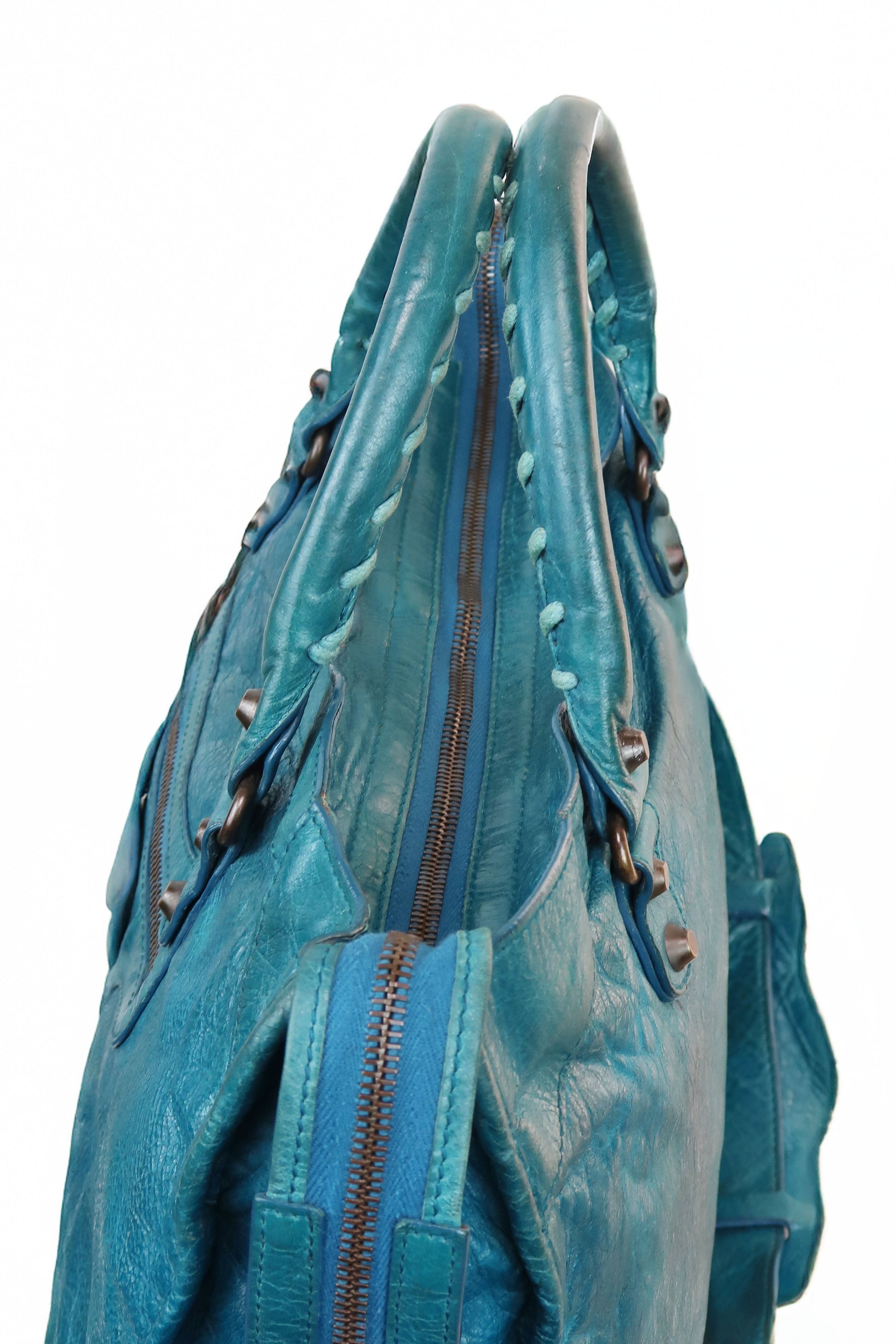 Balenciaga F/W 2012 City Bag in Vert Menthe. Featuring bluelambskin leather, gun mental tone hardware, double zip closure, and interior zip pocket. Does not come with matching mirror. Fits a Macbook.