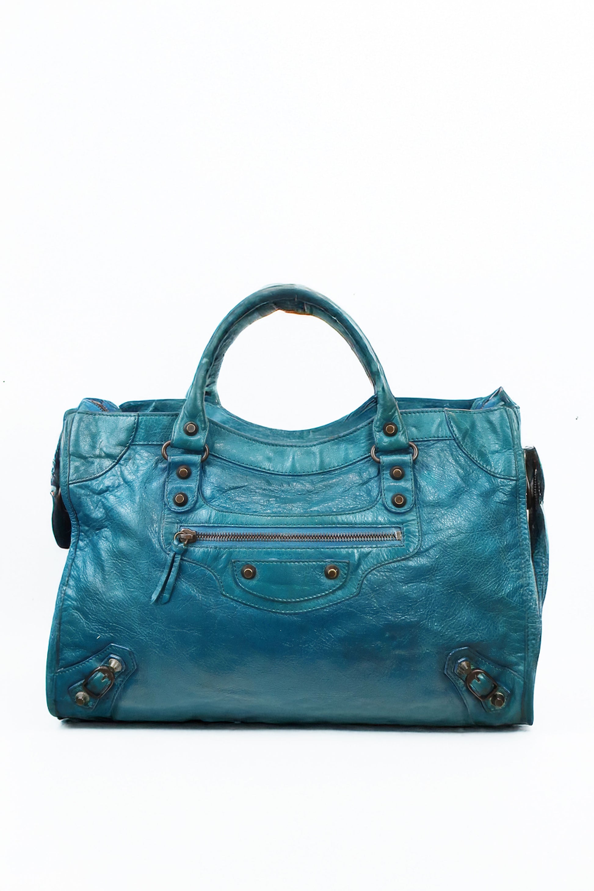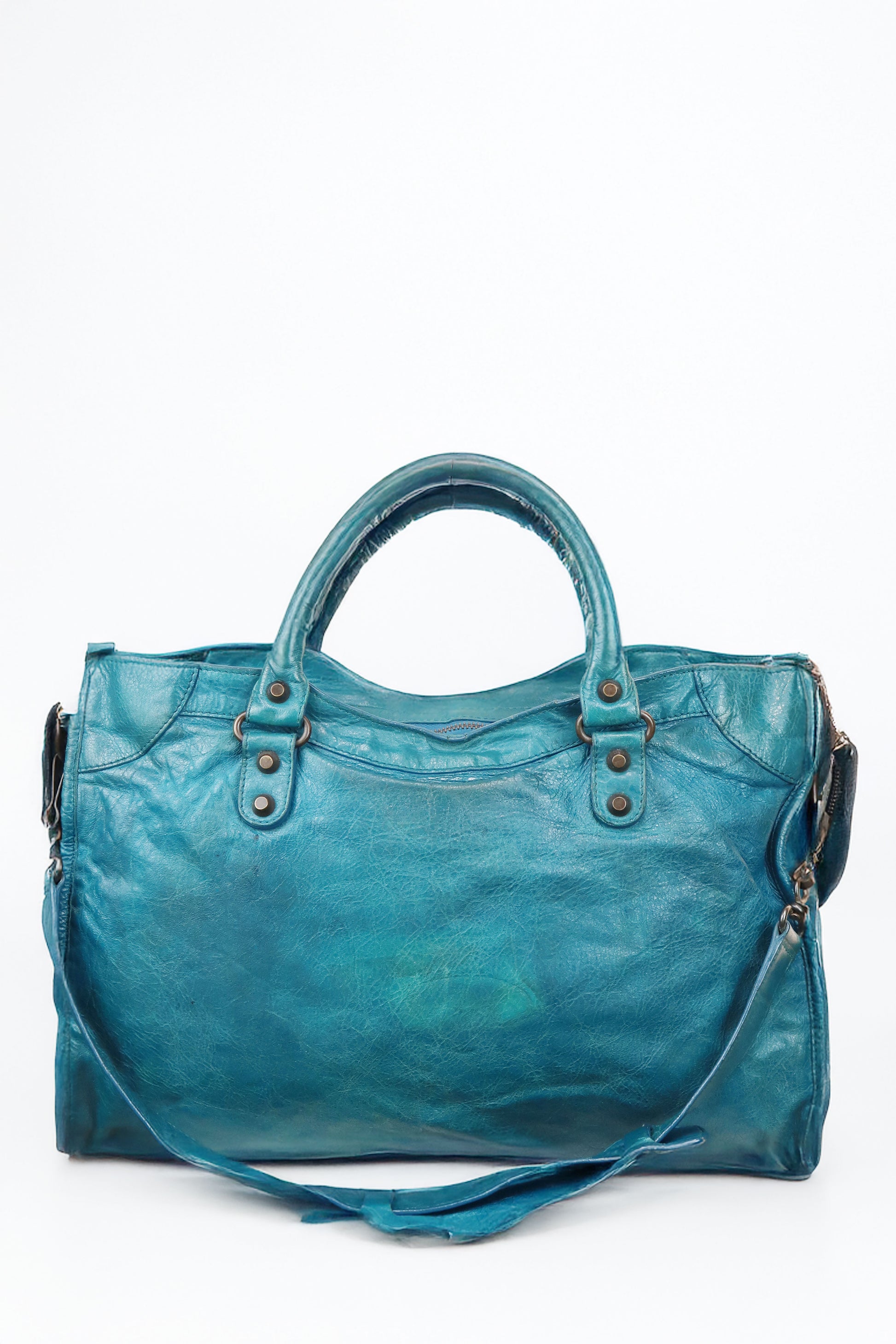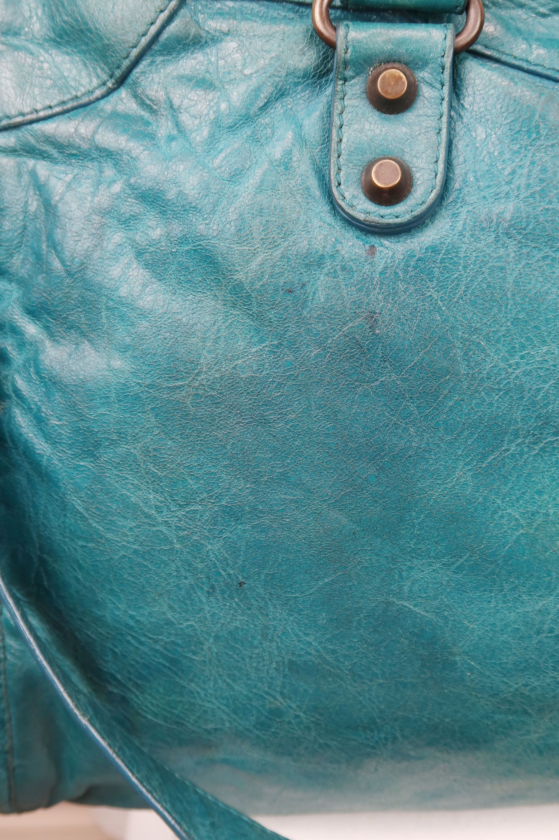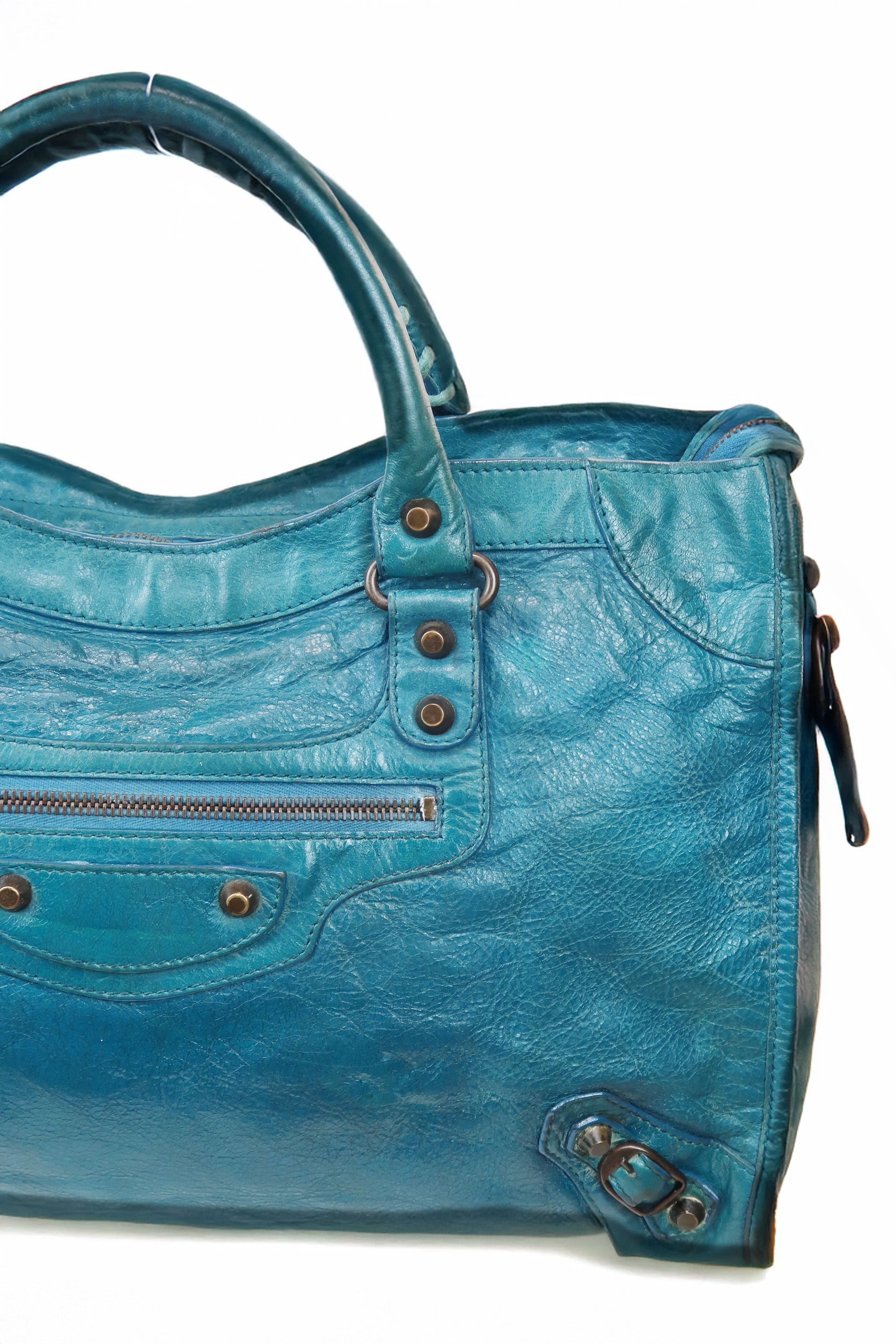Balenciaga F/W 2012 City Bag in Vert Menthe. Featuring bluelambskin leather, gun mental tone hardware, double zip closure, and interior zip pocket. Does not come with matching mirror. Fits a Macbook.