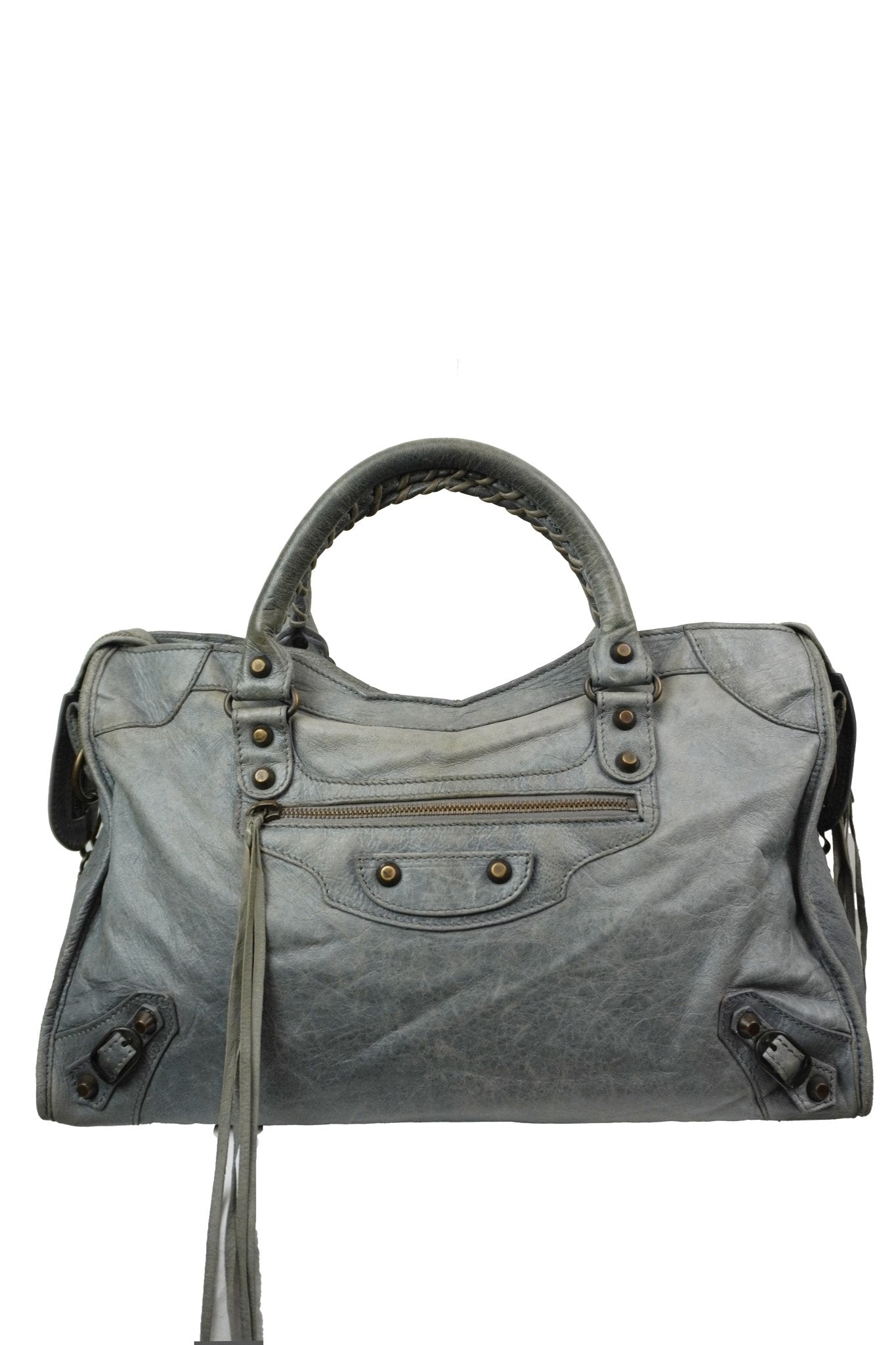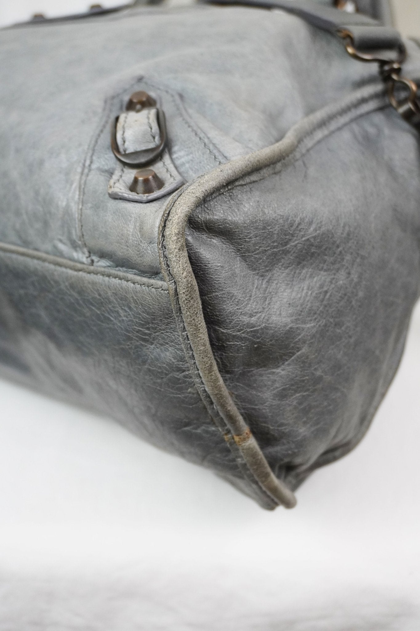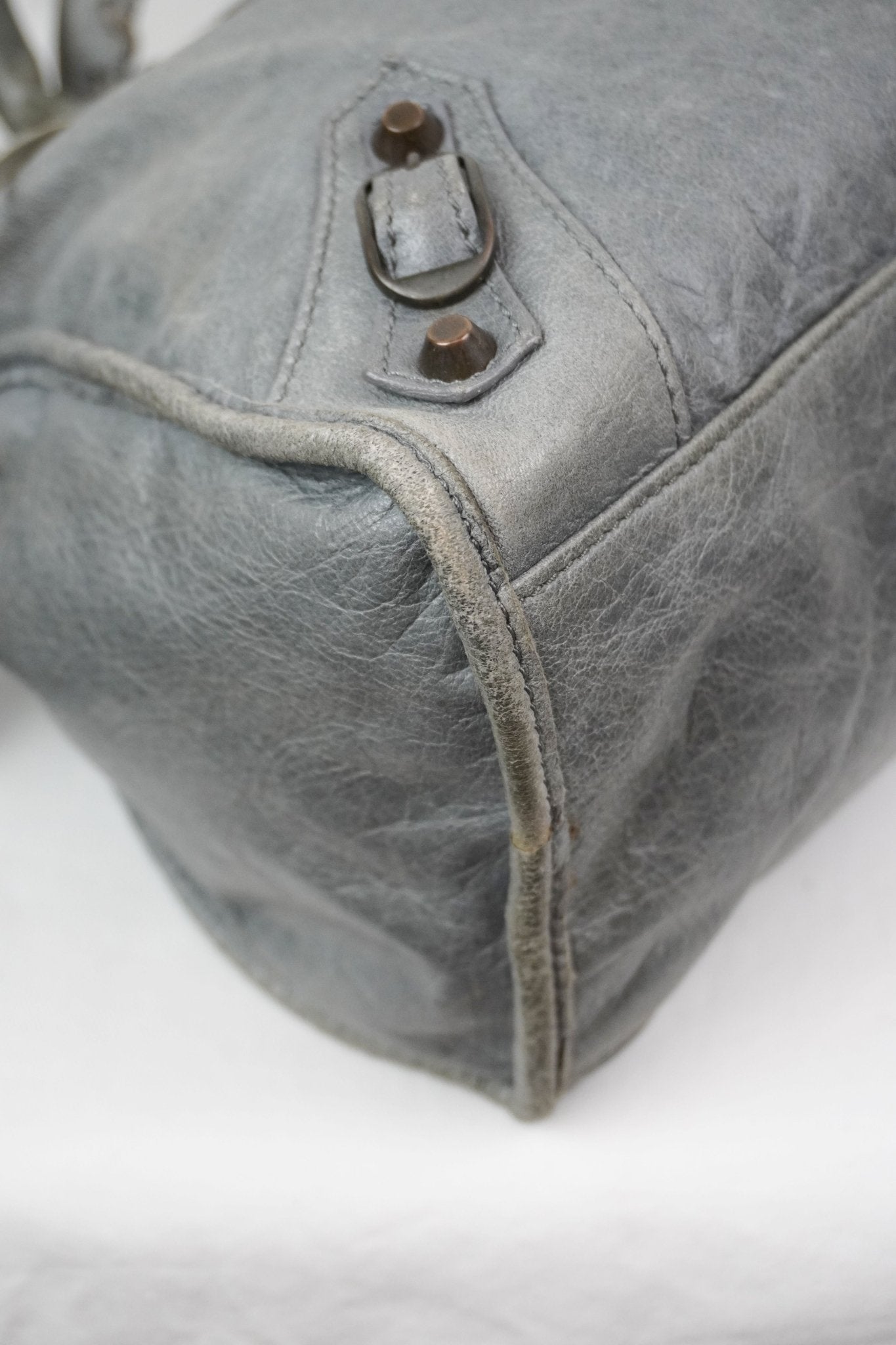 Balenciaga F/W 2012 City Bag in Grey. Does not come with matching mirror. Featuring grey lambskin leather, gun mental tone hardware, double zip closure, and interior zip pocket. Fits a Macbook.