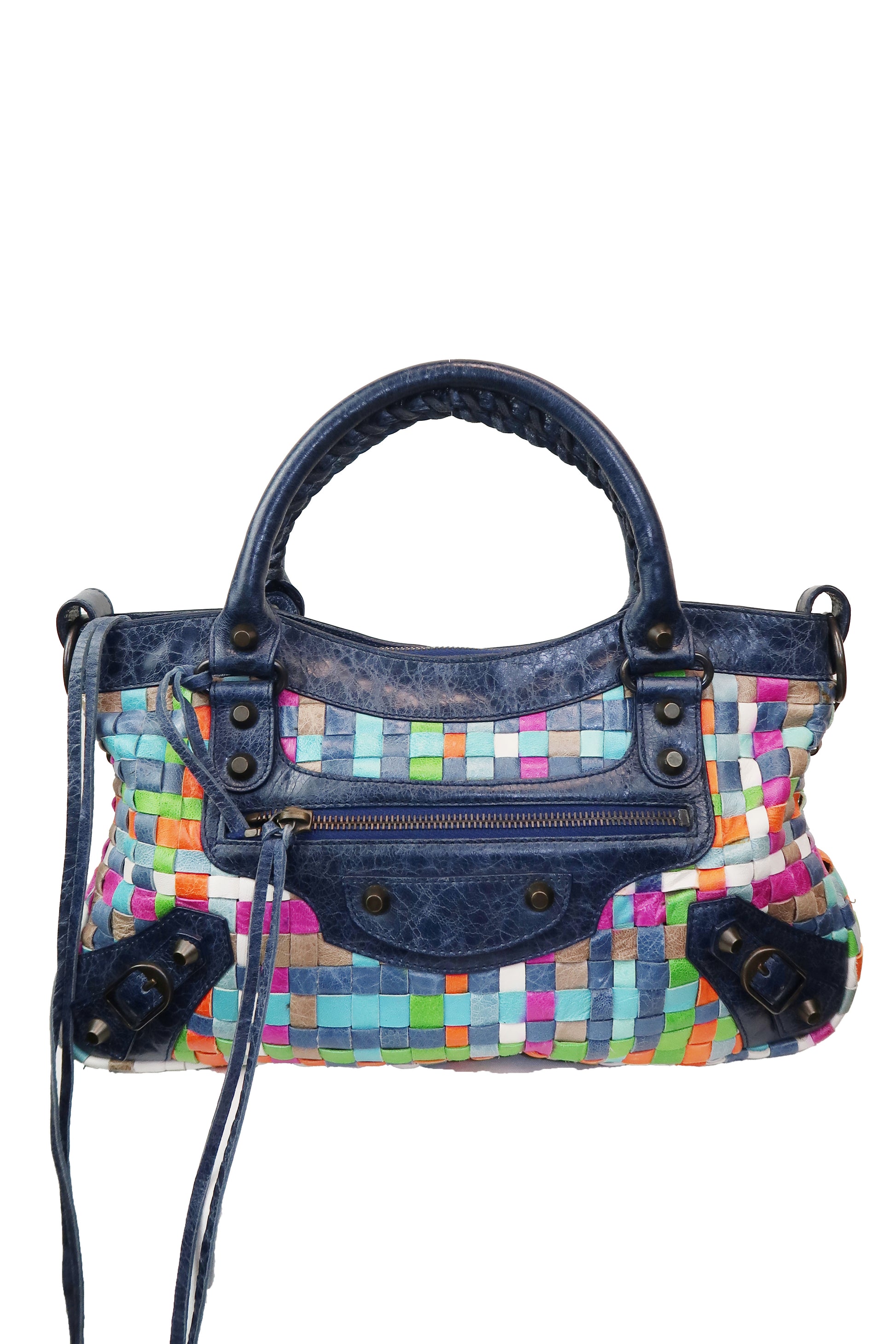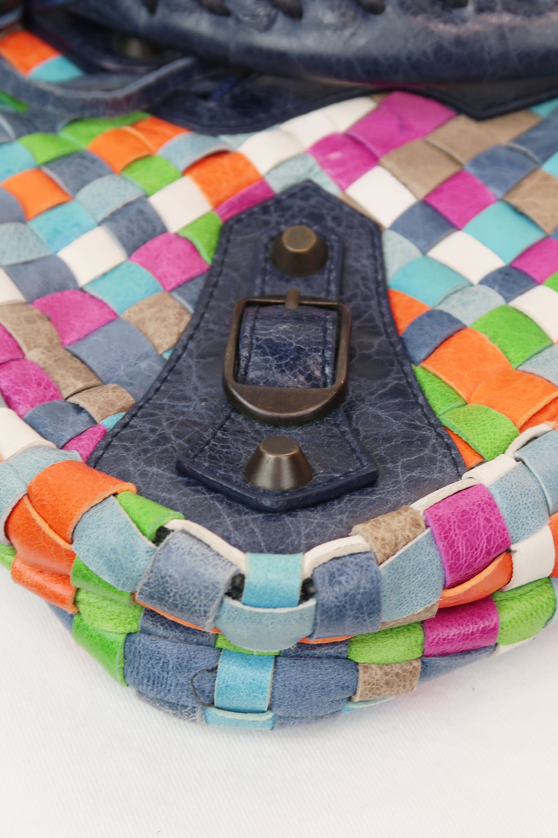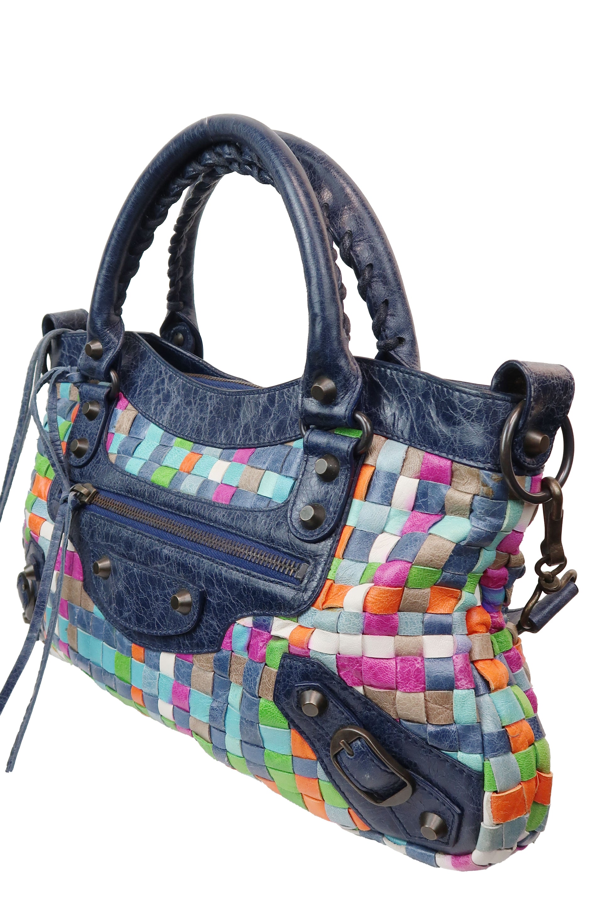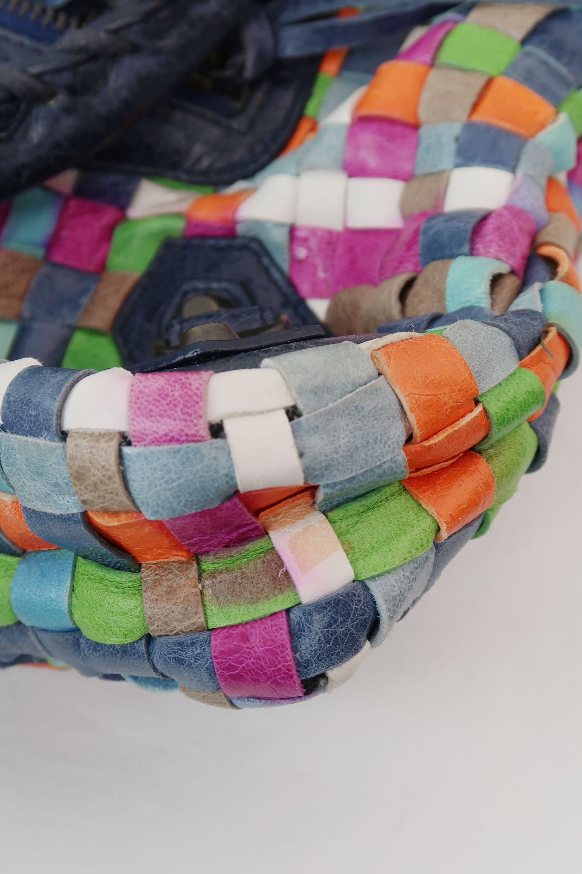 An ultra-rare piece from Balenciaga’s early 2000s archive. This Woven Multicolor First Bag, released in Spring/Summer 2005 under Nicolas Ghesquière, is a true collector’s find — a playful mix of contrasting leather panels in a rich, intentionally eclectic palette.