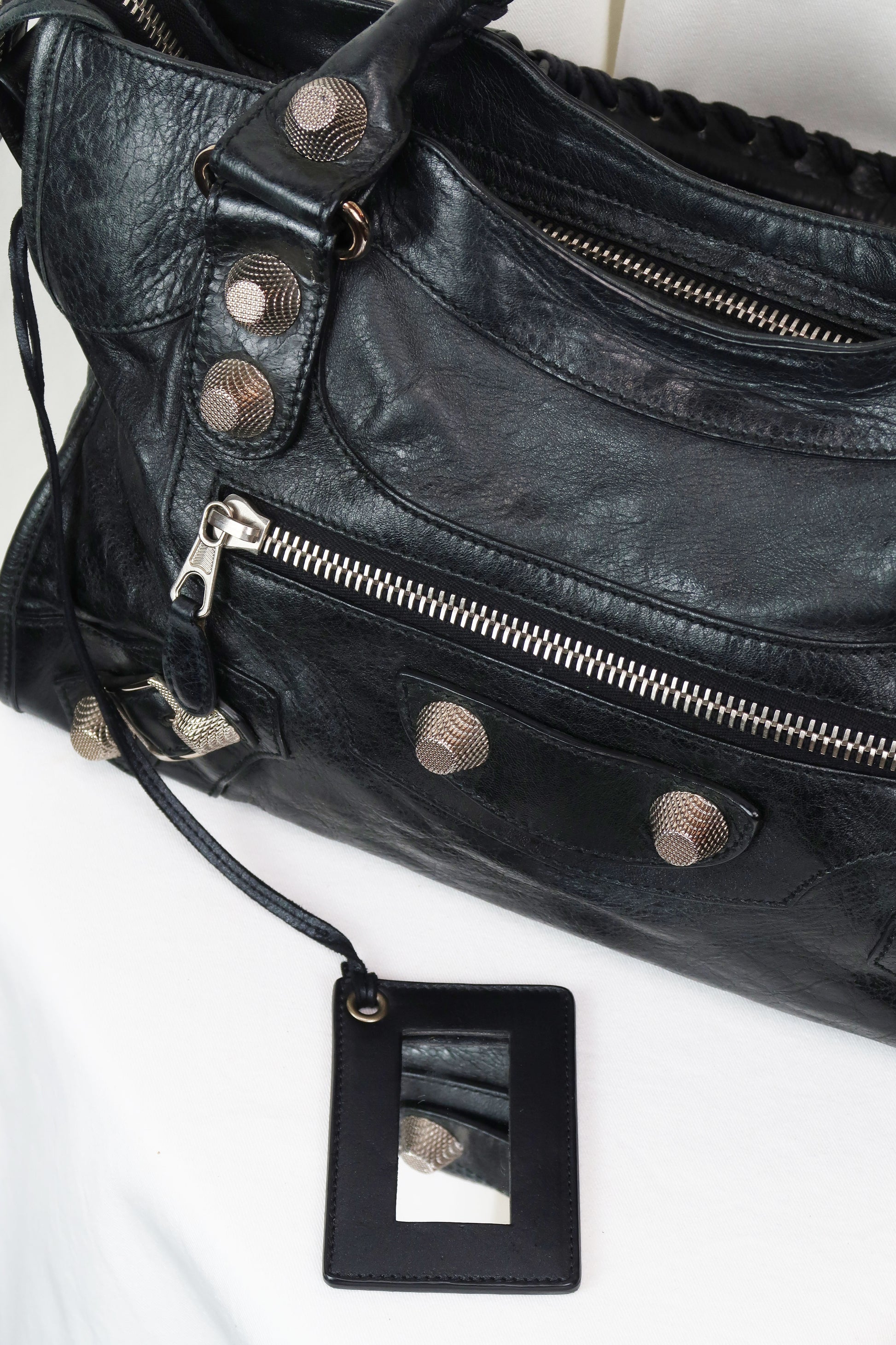 Crafted from supple, distressed lambskin leather, the bag offers a slouchy silhouette with braided top handles and a front zip pocket. The deep black tone and silver hardware make this piece endlessly wearable — edgy, minimal, and unmistakably vintage Balenciaga.