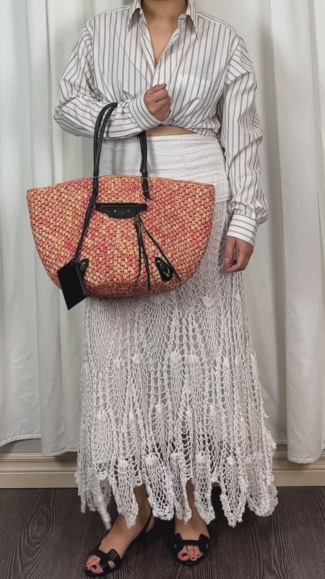 Balenciaga Raffia Tote Bag. Featuring pink and beige raffia, black leather trimming, matching mirror and interior slip pockets