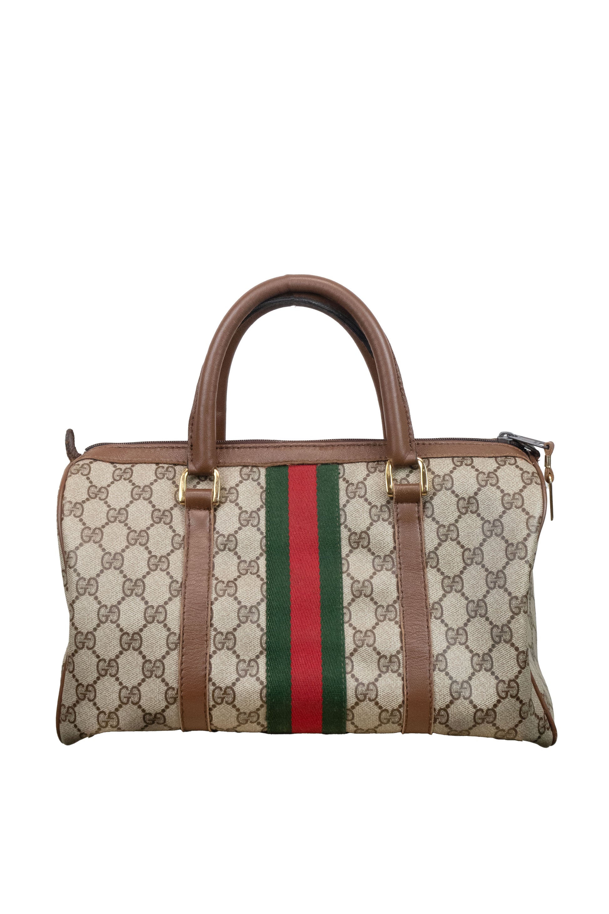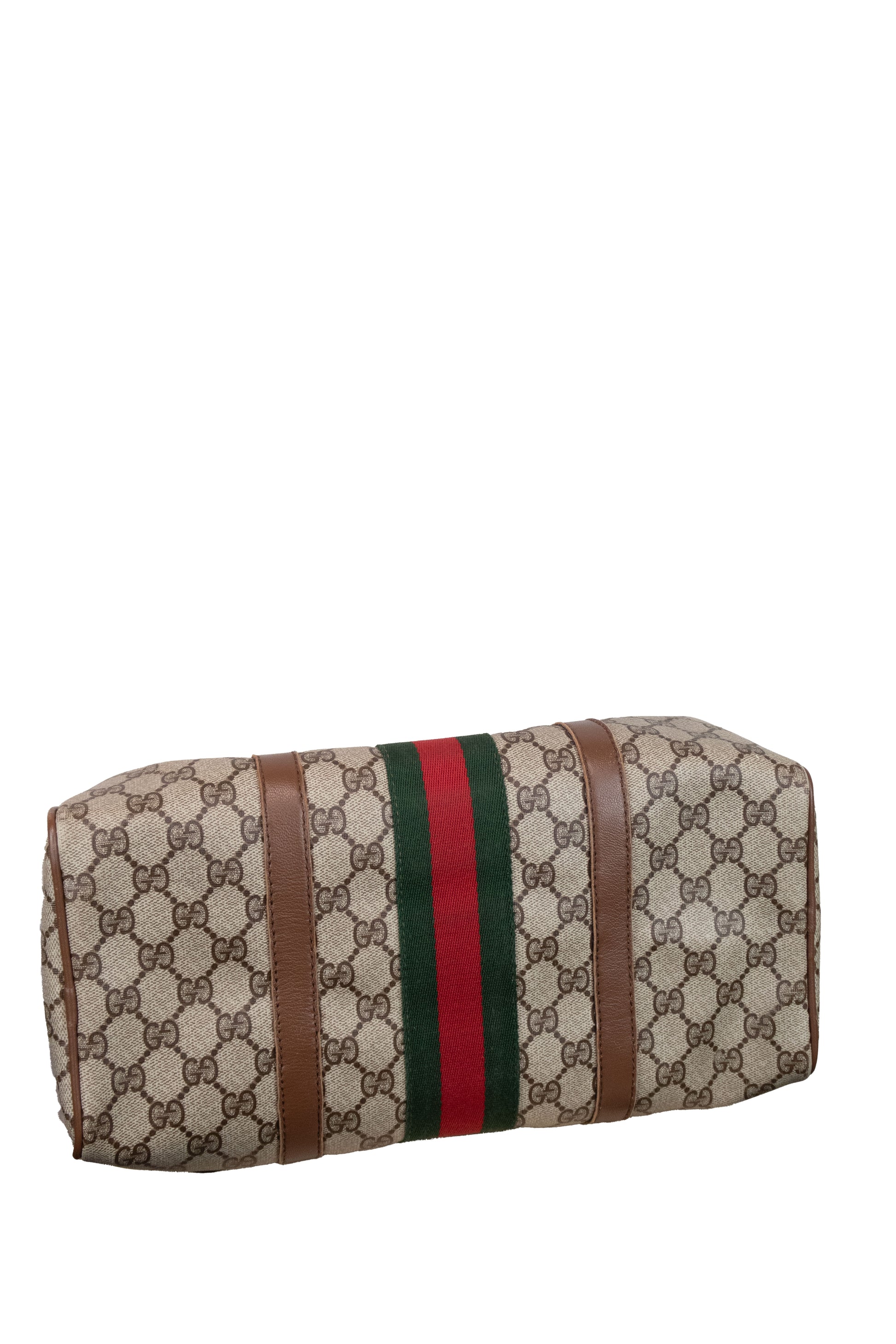 From Gucci's 1980 collection, this boston bag features GG monogram canvas with brown leather trim, double top handles, iconic green-red web detail, and gold-tone hardware.
